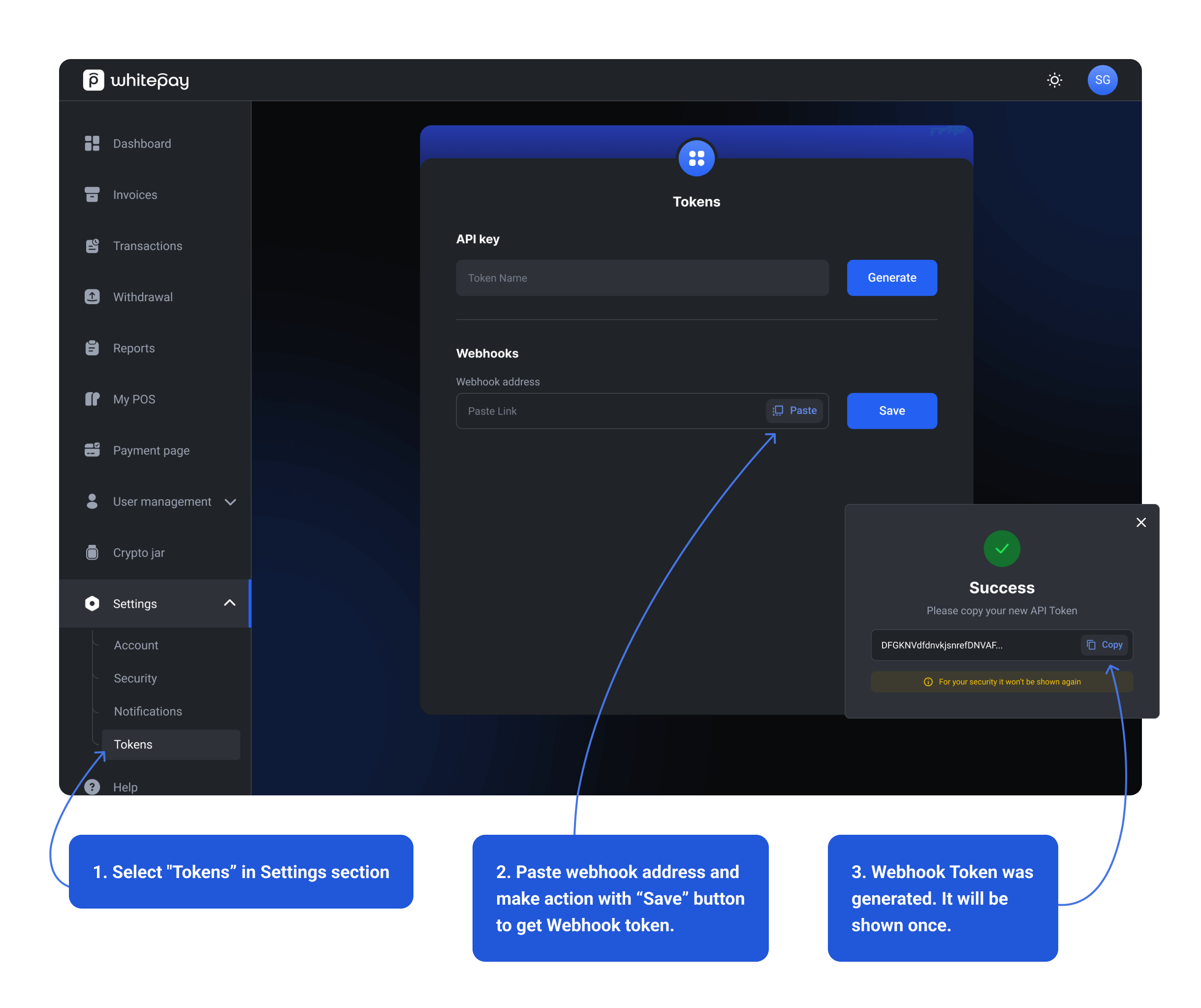 Whitepay Webhooks utilizes Signature Token for signing Requests which sends to Webhook Targets. Webhooks are divided into general and webhooks related to payment pages. You can get your Signature Token on Tokens settings page in CRM for general webhook settings or on Payment page settings page for payment page webhook settings.
